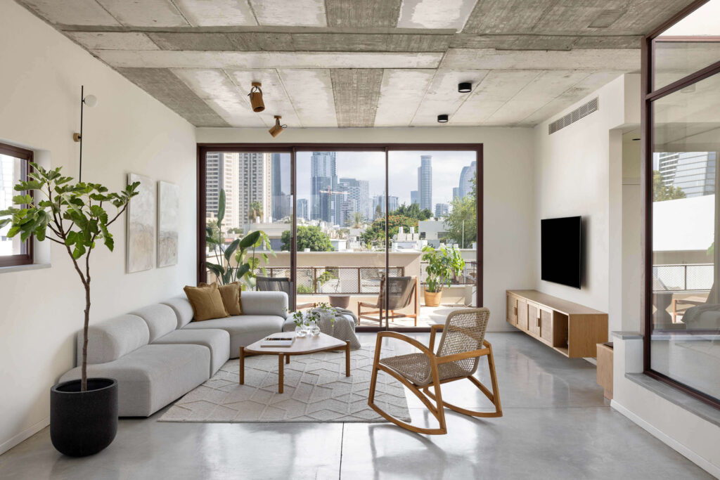 במרכז הדירה עובר פטיו שמחבר בין שתי הקומות ומכניס לחלל אור, אוויר וצמחיה רעננה.